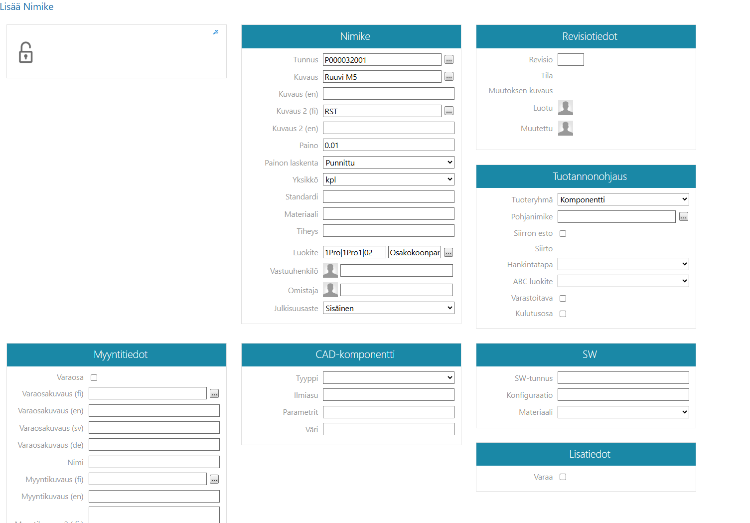 Täytä nimikkeen tietoihin tunnus, kuvauskentät, paino, yksikkö ja tuoteryhmä. Mikäli yrityksesi järjestelmään on määritelty muita pakollisia kenttiä, täytä ne myös.