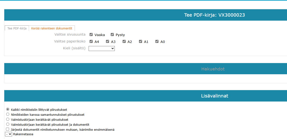 Mikäli haluat saada kerättyä kaikki yhden nimikkeen rakenteessa olevat piirustukset yhteen pdf-tiedostoon ilman normaalin pdf-kirjan xml-pohja-asetuksia puhtaasti vain pdf-tiedostot yhteen "nippuun",