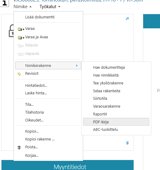 2. Valitse ylhäältä "Nimike" ja valikosta "Nimikerakenne" ja "PDF-kirja"