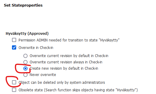 Ylikirjoitusvalinta “Never overwrite” pitää ottaa pois päältä. Sen sijaan esim. “Create new version by default in Check-in” on hyvä vaihtoehto hyväksytty-tilalle, kun päällekirjoitus halutaan mahdollistaa