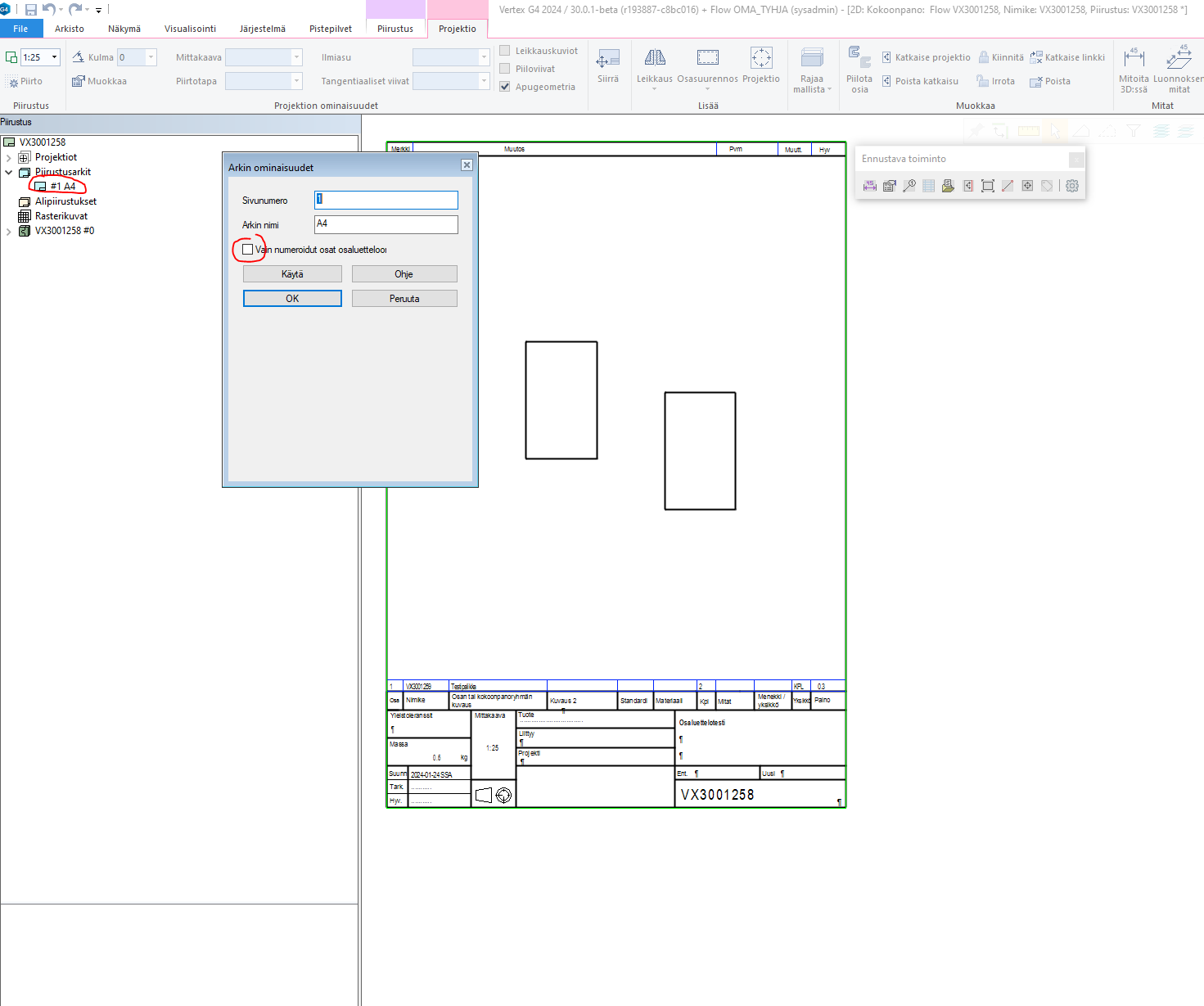 Klikkaa oikealla hiiren napilla esiin halutun piirustusarkin ominaisuudet ja ota rasti pois ominaisuudelta “Vain numeroidut osat osaluetteloon”. Kun tämän jälkeen päivität piirustuksen, kaikki osat näytetään osaluettelossa.