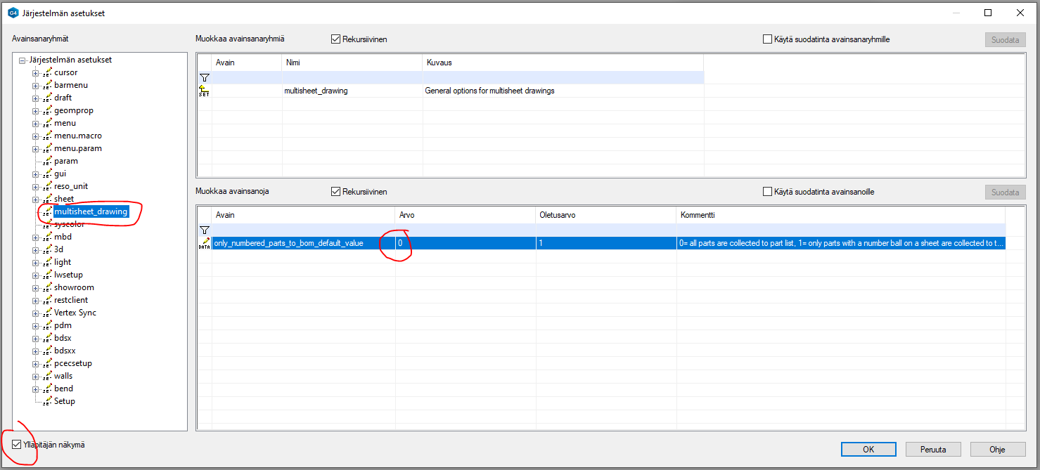 File/Tiedosto → Järjestelmäasetukset → Muokkaa. Raksi päälle Ylläpitäjän näkymä vasemmasta alakulmasta ja valitse “multisheet_drawing”. Anna avainsanalle “only_numbered_parts_to_bom_default_value” arvoksi 0. Tallenna asetuarvon muutos OK:lla ja uudelleenkäynnistä G4.