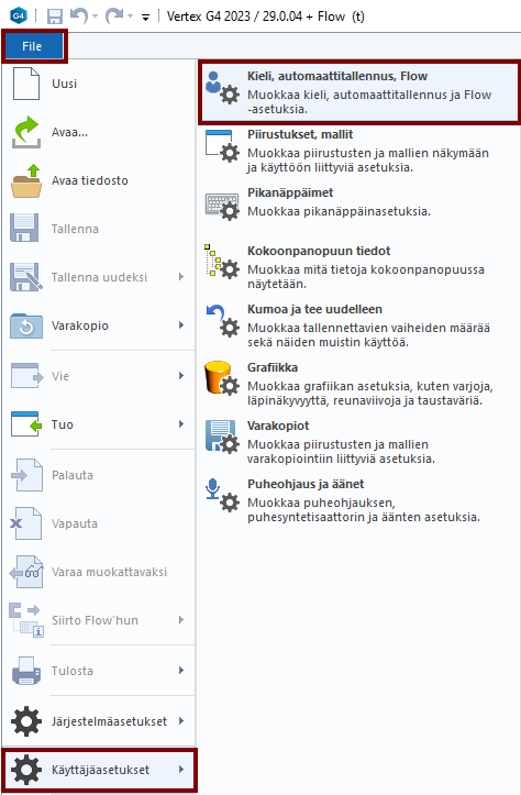 - Valitse File > Käyttäjäasetukset > Kieli, automaattitallennus, Flow