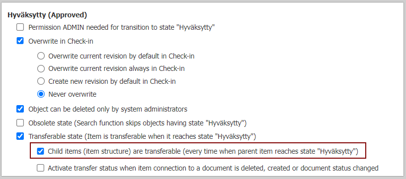 Valitse Portaali > Workflow > Approved > Aseta päälle valinta Child items (item stucture) are transferable every time when parent item reaches state Approved (=transferable state)