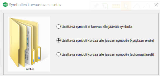 Kaaviosymbolin voi korvata osoittamalla symboli olemassa olevan symbolin päälle. Vanhalle symbolille syötetyt kaaviotiedot kopioidaan automaattisesti uudelle symbolille. Aiemmin tämä toiminnallisuus oli laitettava erikseen päälle toiminnolla Symbolien korvaustavan asetus. Nyt oletuksena on automaattisesti vaihtoehto Lisättävä symboli korvaa alle jäävän symbolin (kysytään ensin).