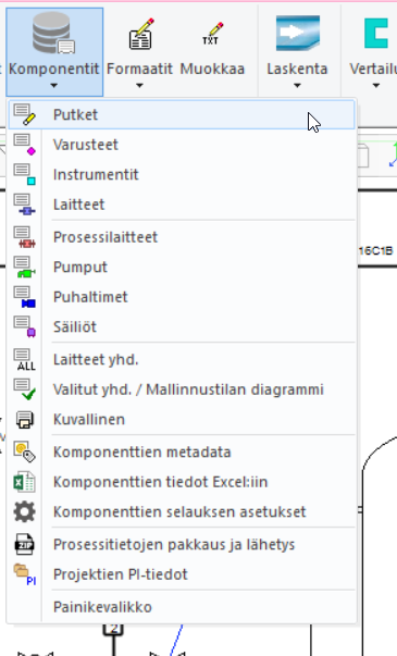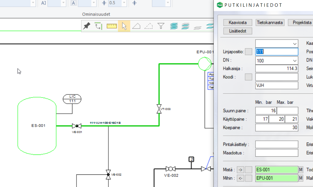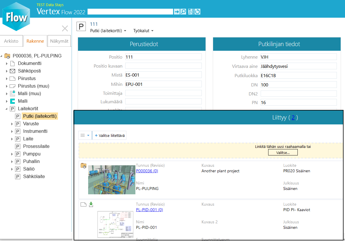 Projektin kaaviotiedot ja niiden listaukset saadaan nyt myös Flow'sta katseltavana olevan PI-kaavion kautta. Myös liittyviä metatietoja pääsee katsomaan PI-kaavion laitekorteilta. Kaaviotiedot saadaa myös katseltavana olevan, samaan projektiin kuuluvan, 3D-mallin kautta.