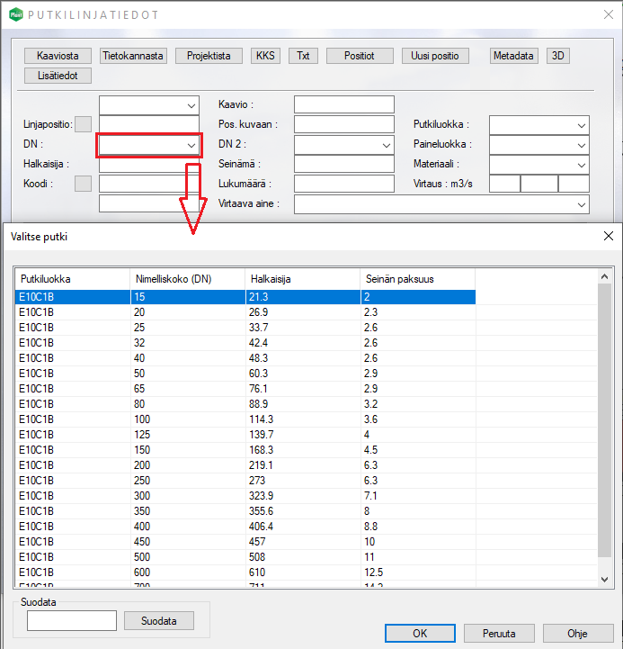 Kun ollaan kirjauduttu Flow-järjestelmään ja kaaviossa putkilinjan laitekortilta mennään DN-kentän kautta valitsemaan putkea, niin valittavaksi tarjottavat putkikoot haetaan nyt valitun putkiluokan perusteella Flow'sta. Tämä helpottaa Flow-järjestelmällä operoivien asiakkaiden keskitettyä ylläpitoa, kun enää ei tarvitse tehdä paikallisia muutoksia käyttäjien koneille. Ominaisuus on parannettu myös versioon 28.0.07. (Vertex ID: PLANT-4344)
