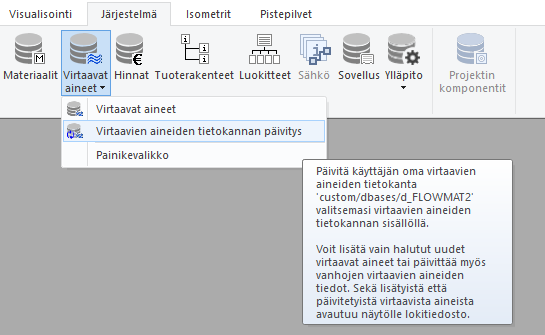 Lisäsimme virtaavien aineiden tietokantaan d_FLOWMAT2 uusia kenttiä teknisen laskennan tueksi. Näiden kenttien päivittäminen asiakaskohtaisiin tietokantoihin tapahtuu automaattisesti, kun jokin ohjelman teknisistä laskennoista käynnistetään ensimmäisen kerran uudella pääversiolla 2023. Lisäksi olemme lisänneet kyseisen tietokannan päivittämiseen toiminnon, jonka avulla voit tarvittaessa päivittää tiedot Vertexin ylläpitämästä tietokannasta käyttäjän ylläpitämään tietokantaan. (Vertex ID: PLANT-4363)