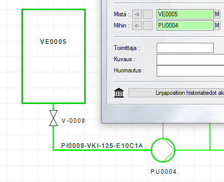 Huom! Putkilinjan laitekortilla Mistä/Mihin kentät ovat nyt vihreäksi merkatut, jos kytkennät on tehty uudella liitostavalla ja liittyvät positiot löytyvät projektista ts. samasta tai toisesta kaaviosta. Tämän lisäksi positioon liittyvät samasta kaaviosta löytyvät elementit merkataan. Vanhojen pelkkien tekstimuotoisten Mistä/Mihin-liitosten osalta kenttiä ei merkata, mutta samasta kaaviosta löytyvät elementit merkataan.