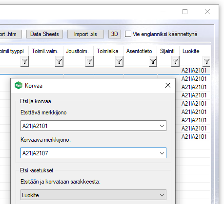 Useamman kaaviosymbolin vaihtaminen toiseksi onnistuu nyt tietokannassa vaihtamalla symbolien luokitteen toiseksi. Voit nyt esimerkiksi vaihtaa kaikki kaaviossa olevat yleiset venttiilit palloventtiileiksi. Luokitteen massamuutoksiin löytyy valmiit ja hyvät työkalut tietokantanäytön tilannekohtaisesta-valikosta. Alla olevassa kuvassa näkyy Korvaa-toiminnon käyttöliittymä. Ohjelma suorittaa symbolien vaihdon, kun poistut tietokannasta. (Vertex ID: PLANT-4428)