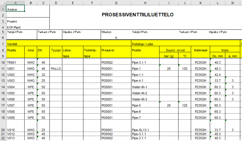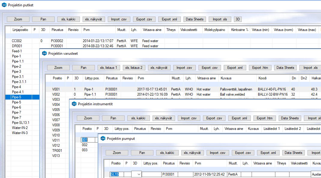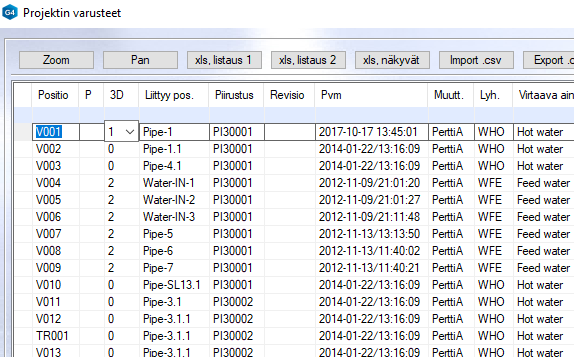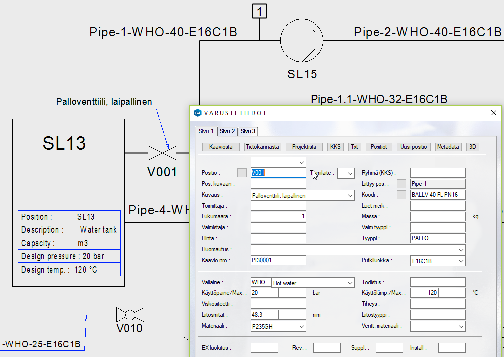 Voit syöttää positiotunnuksia ja prosessiarvoja kaavioiden elementeille kaksoisnapauttamalla niitä. Tietotyypeille, kuten putkille, varusteille, instrumenteille ja laitteille, täytetään omat tietonsa joita voit myöhemmin tarkastella ja listata projektikohtaisesti. Kaikki syöttämäsi tiedot kerätään projektin alle tietokantoihin joista usean kaavion tiedot saadaan keskitetysti listattua itse kaavioita avaamatta. Listauksia varten on luotu valmiita esimerkiksi Excel-tulostuspohjia eri tietotyypeille.