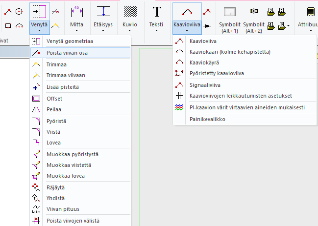 Piirrä kaavio käyttämällä kaavio- ja signaaliviivoja sekä valmiita standardien PSK 3601 ja PSK 3605 mukaisia kaaviosymboleja. Voit itse vapaasti piirtää itse haluamiasi laitteita ja varusteita ja määrittää ne symboleiksi, joille voidaan syöttää myöhemmin kaaviotietoja. Käytössäsi ovat kaikki ohjelmiston 2D-piirtotyökalut joilla voit muokata tekemääsi kaaviota. Piirtämiesi viivojen ja symbolien tasot, värit, viivanleveydet ja viivatyypit ovat valittavissa vapaasti joko etukäteen tai jo piirretyille elementeille. Voit tuoda kaavion myös toisesta suunnittelujärjestelmästä Vertexiin esimerkiksi DWG-muodossa ja voit myöhemmin syöttää putkilinja- ja varustetietoja kaikille Vertexiin tuotujen piirustusten viivoille ja symboleille.