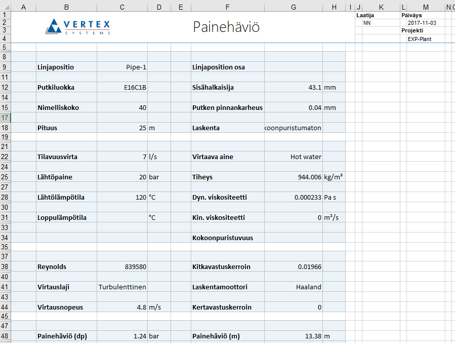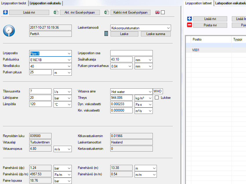 Tarkastele kaaviossa olevien putkilinjojen ja varusteiden painehäviöitä halutulla virtausmäärällä. Varusteiden kertavastuskertoimet ja putkistojen pinnankarheudet voidaan määrittää lähtötietoihin.