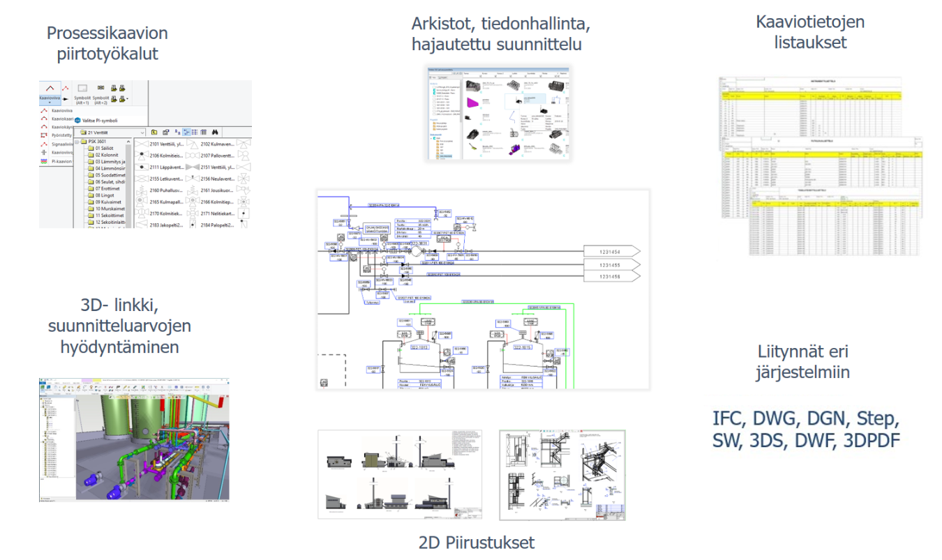 Voit hyödyntää kaavioon syötettyjä kaaviotietoja myös lukuisten erikoistoimintojen kautta. Kaavioon voit lisätä päivittyviä taulukoita ja kaaviotiedoista päivittyviä tekstejä. Voit kopioida jo syötettyjä tietoja elementiltä toiselle ja määritellä elementiltä toiselle periytyvät tiedot. Esimerkiksi putkilinjatietojen muuttuessa muutokset voi periyttää linjalla oleville varusteille. Voit hakea positiotunnuksia kaaviosta, säätää kuvaan tulevia positiotekstejä projektikohtaisesti, luoda omia kaaviosymboleja jne. Tekemäsi kaavioita voit käyttää myös toisessa projektissa nimeämällä kaaviot uudelleen ja viemällä kaaviotiedot uuden projektin alle omalla erikoistoiminnollaan.