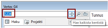 Kun tiedät, että piirustuksen tunnuksessa (piirustusnumerossa) tai piirustuksen arkistokortin muissa tiedoissa löytyy jokin merkkijono, voit syöttää merkkijonon pikahakukenttään ja painaa selaimen Hae kaikista kentistä-painiketta (Nuoli-painike).