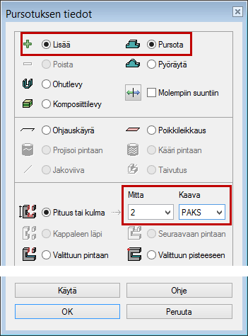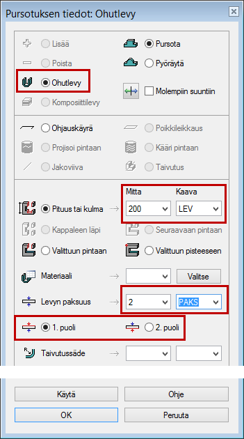- Toimenpiteeksi valitaan Ohutlevy ja sille annetaan parametrit, kuten yllä harjoituksessa 1b on esitetty.