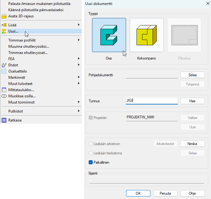 Valitse: Paikallinen. (Jolloin osalle ei tule omaa malli-tiedostoa).