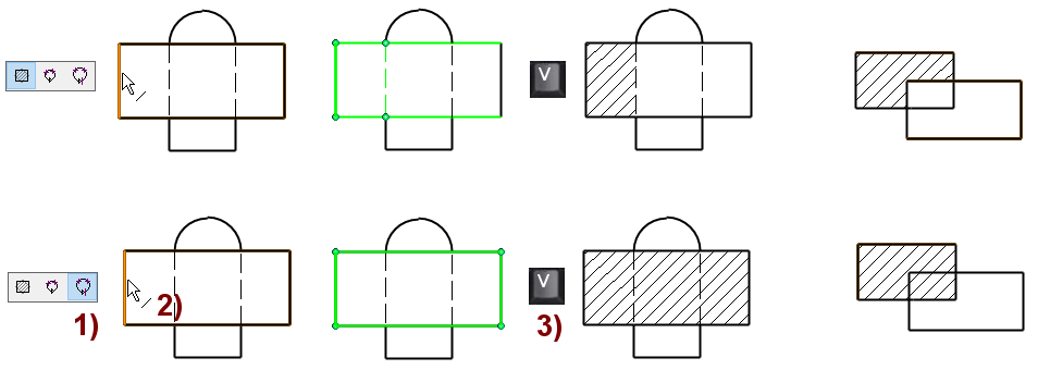 Ylärivissä oikeanpuoleisen "aukko" koostuu erillisistä viivoista, joten se ei toimi aukkona. Sen osoittaminen aukon viivaksi pilaa leikkausviivoituksen. Ylärivin oikeanpuoleisin kuva.