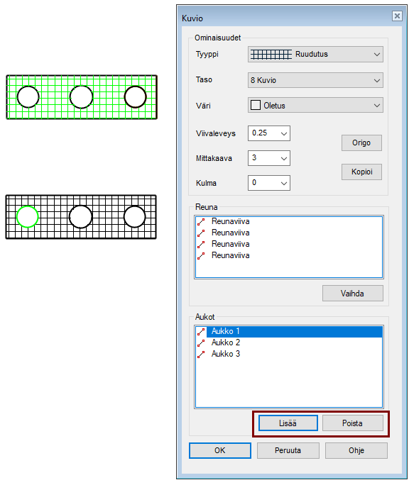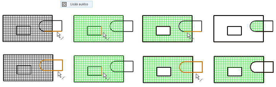 Tämän toiminnon edellytyksenä on että aukot ovat kokonaan kuvion päällä ja että ne ovat yhtenäistä viivaketjua.