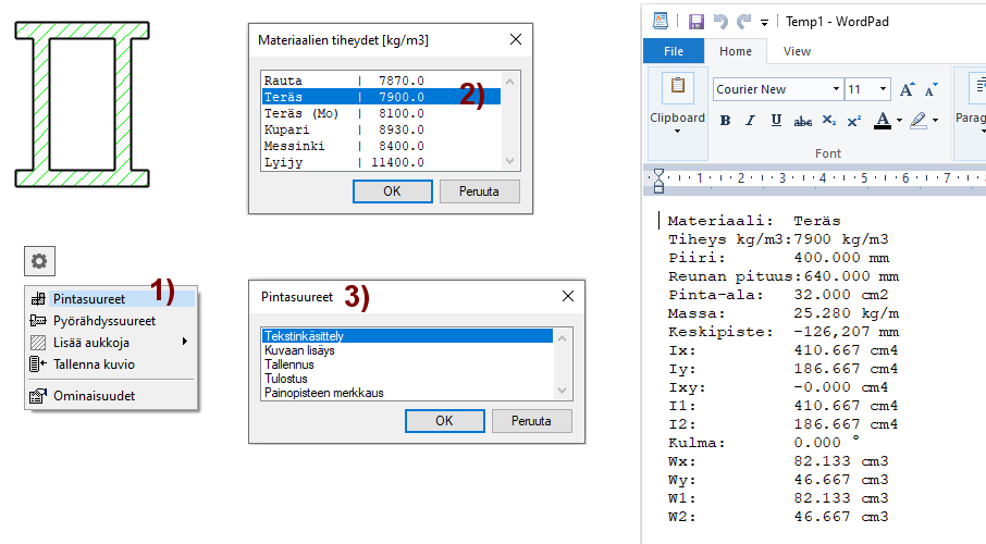 Kuvioiden avulla voit analysoida palkin poikkileikkauksen lujuusteknisiä arvoja.