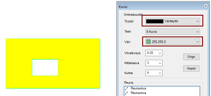 Osoita rajaviivaa (sisäpuolelta). Huomaa että rajaviivojen pitää (oletus-valinnalla) muodostaa suljettu alue. Kuva 1).