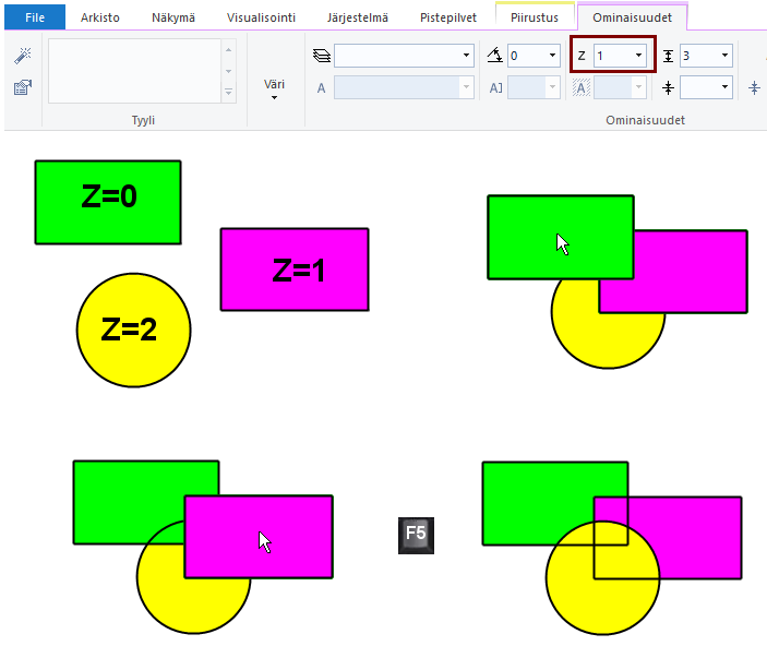 Antamalla väritäyttökuviolle Z-koordinaatin saat haluamasi kuvion nousemaan aina päällimmäiseksi, kuvan päivityksessä F5:lla.