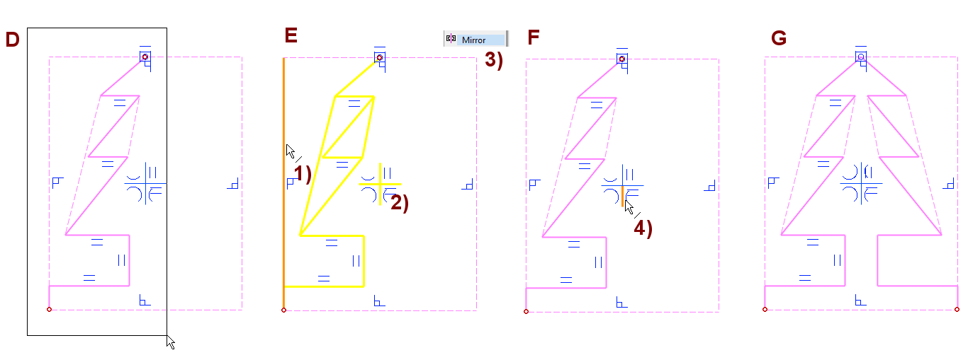 Valitse peilausakseliksi keskiristin pystyviiva 4) kuvassa F.