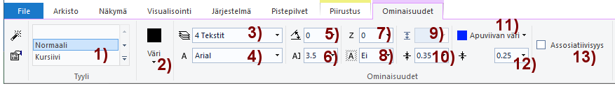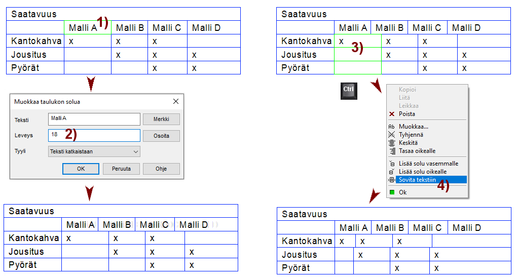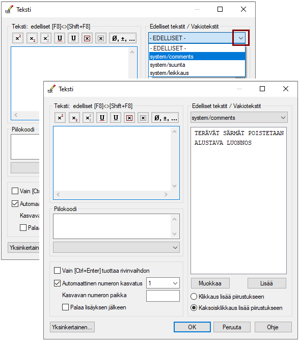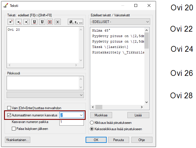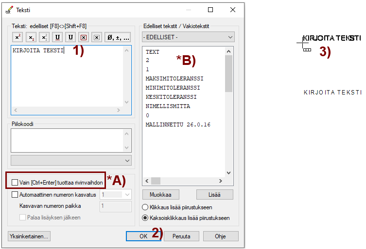 Jos haluat että Enter-näppäimen painallus ei vaihda tekstin kirjoittamista seuraavalla riville, vaan siirtyy lisäämään tekstiä piirustukseen, valitse kohta Vain [Crtl+Enter] tuottaa rivinvaihdon. Kuva *A).