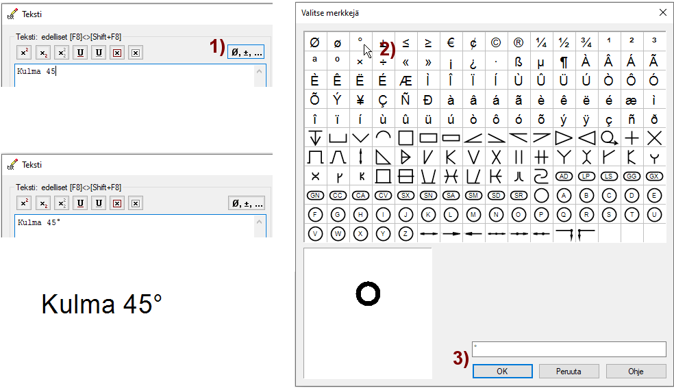Tämä lisää merkit Teksti-dialogiin sille paikalle jossa kohdistin sijaitsee.