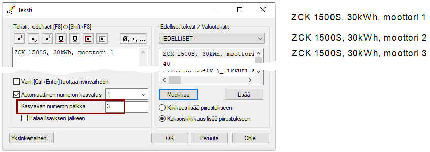 HUOM: Voit lisätä samaa numeroton tekstiä toistuvasti, kun numeron kasvatus on valittu (Kasvatuksen arvolla ei tällöin ole väliä).