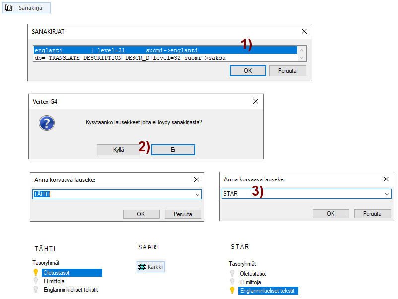Jos piirustuksessa on entuudestaan sanat jo esim. suomen ja englanninkielisillä tasoilla, niin jätä näkyville vain ne tasot joilta haluat käännöksen tehdä.