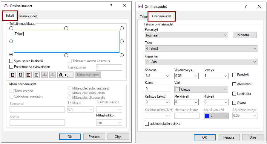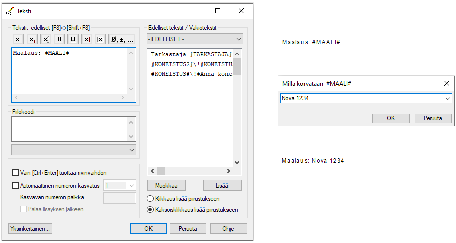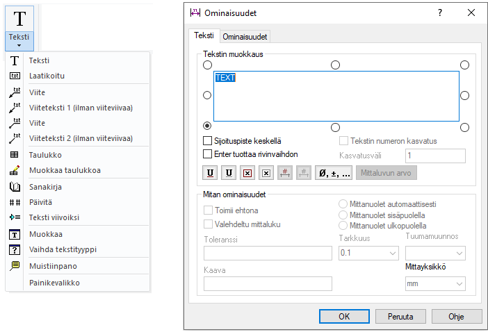 Toiminto avaa Teksti-dialogin, jonka avulla teksti voidaan kirjoittaa tai valita lisättävä teksti.