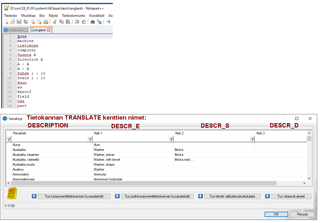 Tietokanta TRANSLATE (Eli tiedostot d_TRANSLATE ja d_TRANSLATEc)