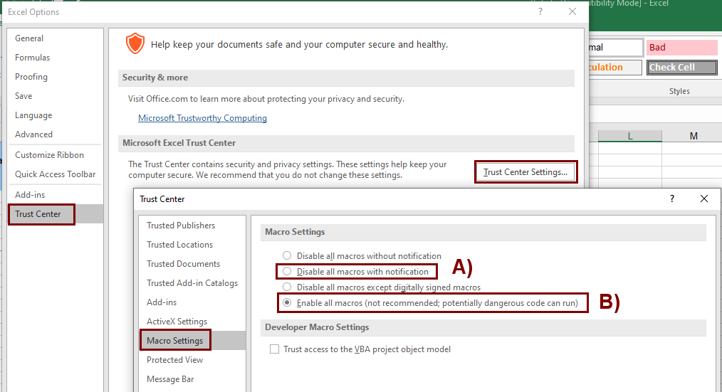 Jotta osaluettelointi Exceliin onnistuu, niin sinun täytyy sallia makrojen suoritus Excelissä.