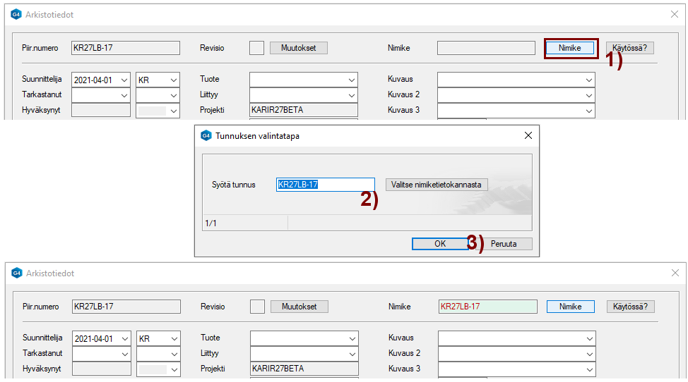 Voit joko hakea tiedot nimikekannasta (d_COMPONENTS) ja täydentää niitä tai voit kirjoittaa tiedot. Kirjoita tiedot