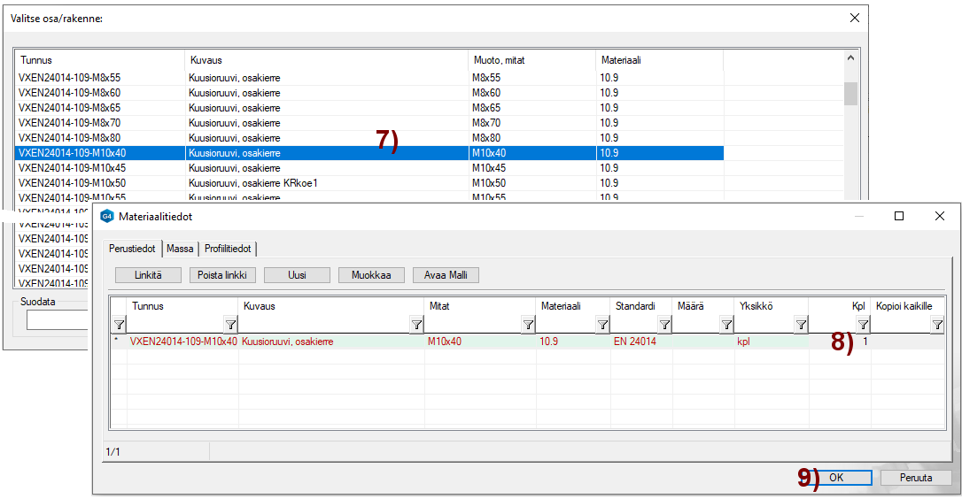 Ohjelma avaa Materiaalitiedot-dialogin.