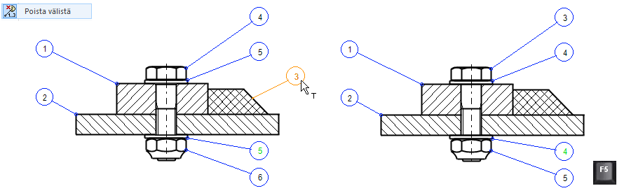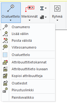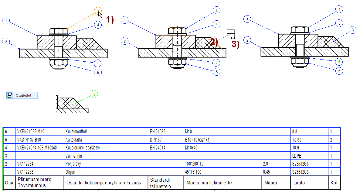 Kun haluat, että piirustukseen lisätä uusi osa, jonka osanumeron haluat olevan jokin muu kuin ensimmäinen vapaa osanumero, niin käytä Osaluettelo > Lisää väliin toimintoa.