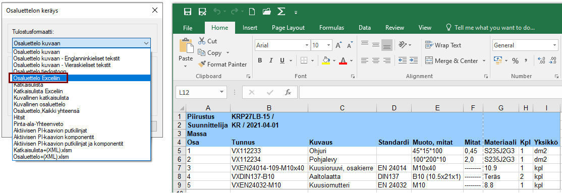 Valitse tulostusformaatti: Osaluettelo Exceliin.