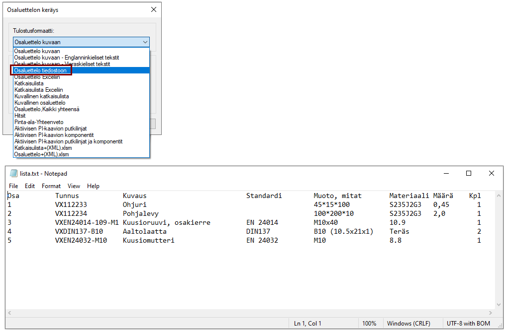 Listaa osaluettelo tekstitiedostoon