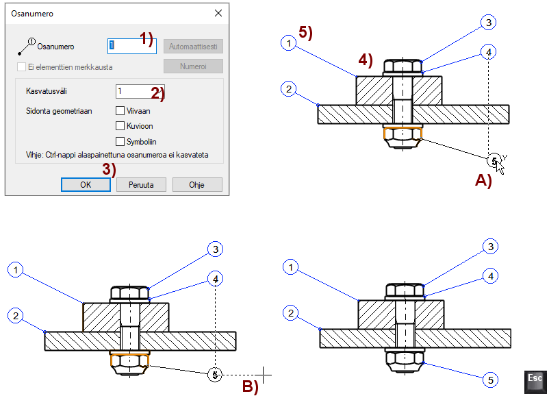 Viiteosanumeron kirjain on väriltään vihreä sen merkiksi, ettei sille ole tarkoitus antaa nimiketietoa, eikä se tule mukaan piirustuksen osaluetteloon.