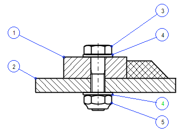 Edellisissä esimerkeissä on käytetty vanhan työkalupakin ruuviliitos-toimintoa, jolla piirustukseen on tuotu ruuviliitos (ruuvi, kaksi aluslevyä ja mutteri). Näillä vanhoilla elementeillä on mukanaan attribuutteja, jotka näkyvät viereisessä listauksessa ylimmäisinä riveinä (4 kpl).