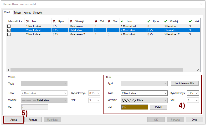 Valitse rivi, jonka tyyppisten elementtien ominaisuuksia haluat muokata. Kuva 2).