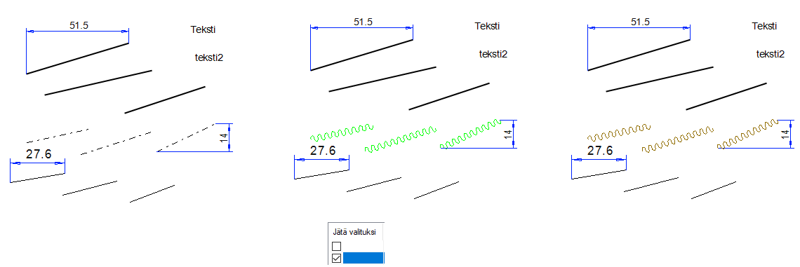 Jos käytit valintaa Jätä valituksi, niin muokkauksen jälkeen, muokatut elementit näytetään vihreällä huomiovärillä, kunnes piirustus päivitetään.