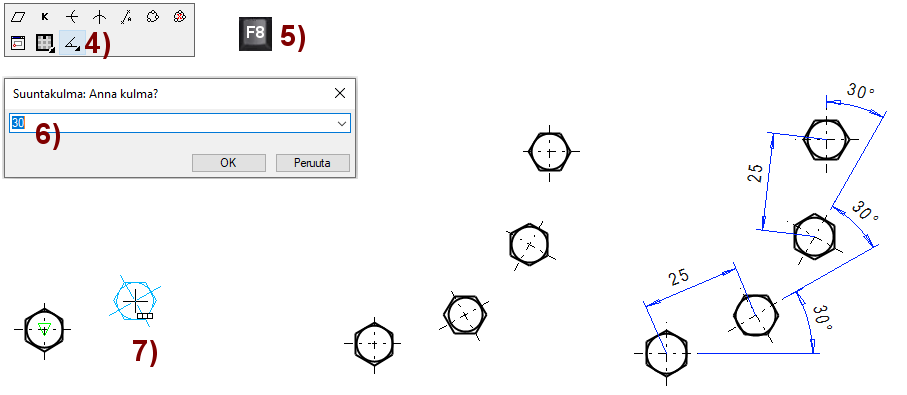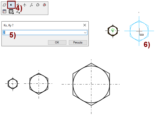 Piirrä ensin geometriaa, jossa voi olla viivojen lisäksi mukana kuvioita (leikkausviivoituksia), tekstejä ja mittoja.