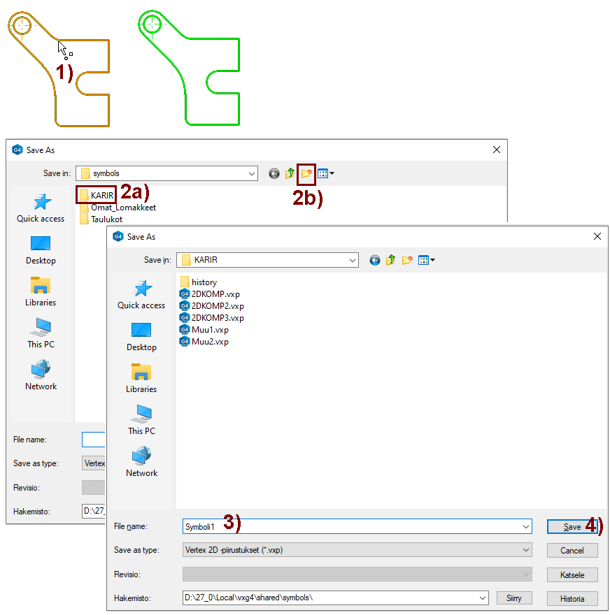 Toiminnallisuus on muutoin samanlainen kuin edellä, mutta ryhmää ei osoiteta. Kaikki piirustuksessa sillä hetkellä oleva geometria tallennetaan symbolikirjastoon.