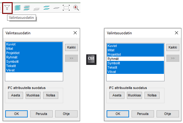 Valikon neljällä viimeisellä painikkeella määritellään ne elementti-tyypit, joita ryhmään valitaan. Oletuksena valinta koskee kaikkia elementtityyppejä.