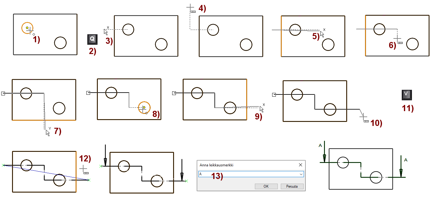 Leikkausmerkinnän paikka voidaan osoittaa kahdella pistellä tai se voi olla murtoviiva. Oheisessa harjoituksessa leikkausmerkintä on murtoviiva ja sen paikoituksessa käytetään hyväksi koordinaattinen nollausta ja suuntalukituksia, jotka on kuvattu harjoituksessa 5. Käytä hakutoiminnallisuuksia, suhteellista osoitusta ja suuntien lukitusta.