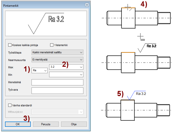 Määrittele mittausmenetelmä, työstötapa ja naarmun suunta