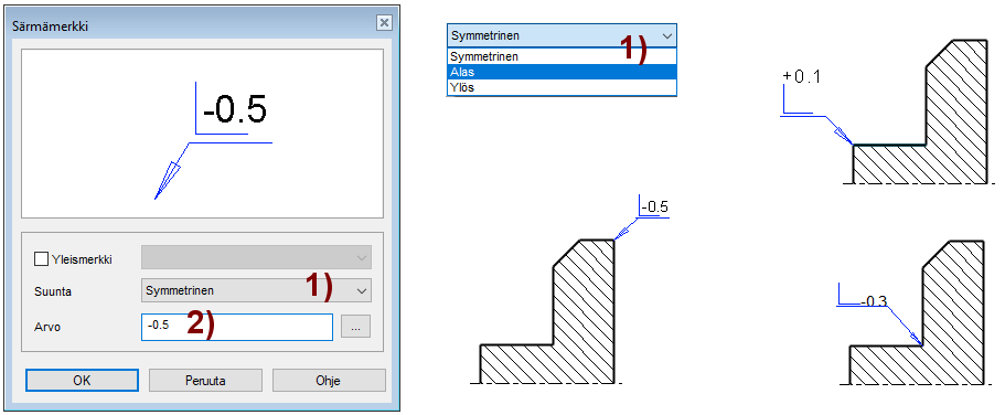 Merkit sopivat sekä ulkosärminen ylityöstön tai sallitun jäysteen merkintään ja sisäsärmien yli- ja alityöstöjen merkintään.