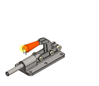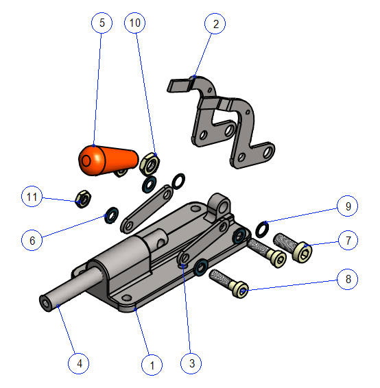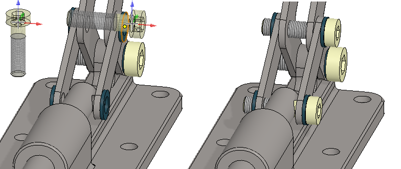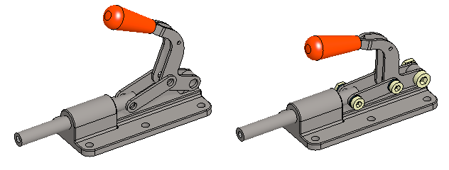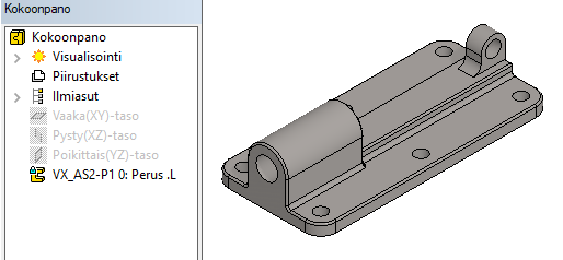 Harjoitus alkaa lukemalla pakattu projekti, jossa on tarvittavat osat. Osat lisätään kokoonpanoon ja ne asemoidaan ehdoilla toisiinsa nähden. Opetellaan mittaamaan etäisyyksiä ja reikien halkaisijoita, jotta oikean kokoiset ruuvit, aluslevyt ja mutterit voidaan noutaa komponenttikirjastosta. Tarkastellaan osien välistä kinematiikkaa, joka mahdollistuu osia rajoittavien ehtojen avulla. Kokoonpanoon tehdään toinen ilmiasu, jossa piilotetaan komponentit, joiden merkitys ylemmän tason kokoonpanoissa on vähäinen tai olematon.